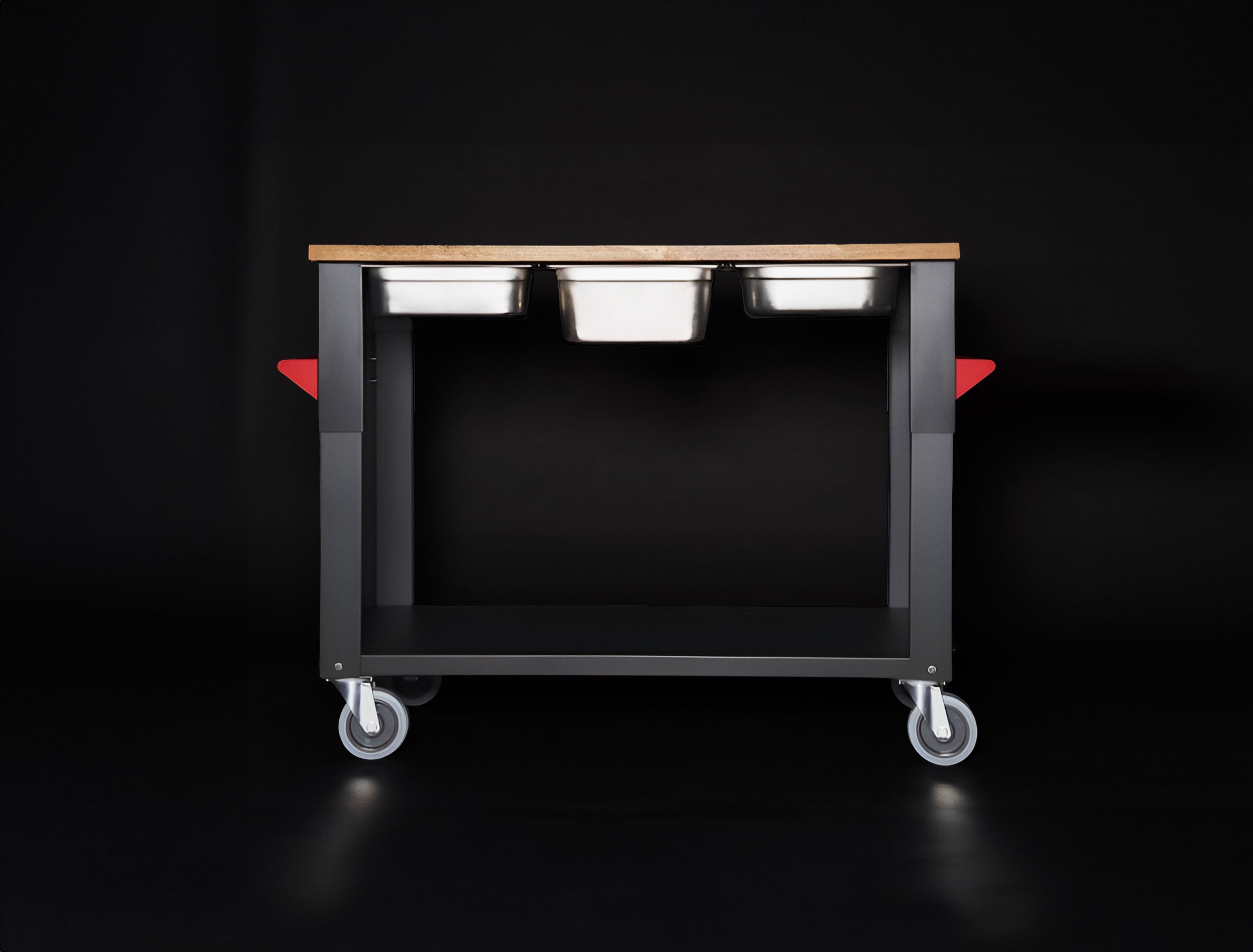 The car is made of solid, powder-coated steel. 4 hard rubber tires with braking function ensure stability and safe work. Thanks to an intelligent height adjustment, the grill table can be adjusted in 5 levels from 90 to 110 cm.